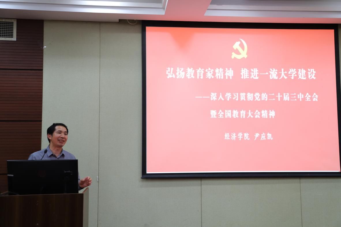 10月11日下午,太阳成集团tyc234cc在东区1号楼115会议室举行全院大会。学院党委书记尹应凯,党委副书记、常务副院长殷凤,副院长毛雁冰,副院长刘康兵以及全体教职工出席会议。太阳集团tyc234cc教务部副部长、课程思政教学研究中心负责人顾晓英作为特邀嘉宾参与交流分享。此次大会由党委副书记、副院长冯玉鑫主持。 会议伊始,由学院分管领导对负责的工作进行了通报。毛雁冰介绍了2024年研究生工作、外事工作以及科研工作的进展。刘康兵汇报了本科专业建设、本学期教学工作以及毕业情况,分析了教学过程中的问题,并提出了优化人才培养流程、提高人才培养质量的措施。冯玉鑫就学生毕业、就业、新生适应性教育、招生、安全等方面进行了汇报,并感谢全院教职工对毕业生就业工作的支持。 随后,尹应凯以“弘扬教育家精神 推进一流大学建设”为主题开展学习党的二十届三中全会和全国教育大会精神的宣讲工作,尤其针对师德师风建设专题作了深入分享。他强调了提升教师教书育人能力的重要性,并倡导健全师德师风建设的长效机制。同时,结合学校第四次党代会精神,他还提出了教育家精神的重要性,以及钱伟长校长爱生如子的教育理念,同时强调了教师身体健康的重要性。此外,他还以“学生成长,是我们共同的专业”为题,对师德师风建设进行了宣讲。 在师德师风教育环节中,特邀嘉宾顾晓英分享了她获得上海市“四有好老师”荣誉的心得体会,以及思政课“项链模式”和获得三届国家级教学成果奖背后的真实感人的故事,为在场的老师们提供了宝贵的经验和启示。另外,每位教职工还签收了太阳集团tyc234cc师德承诺书,牢记立德树人根本任务,遵循上大校训,赓续红色基因,爱校如家,爱生如子,追求卓越。 此外,优秀全程导师陈慧芳老师分享了指导和培养学生的经验和心得,她深入细致地指导学生全面发展,让学生认识到人际关系的处理、兴趣爱好的培养以及学习成绩的重要性。她还会为学生推荐相关竞赛和学习书籍,旨在帮助学生更好地适应大学生活,全面发展个人能力。 最后,殷凤对各位老师上半年为学院发展做出的贡献表示感谢,希望大家以刚才尹书记宣讲的党的二十届三中全会和全国教育大会精神为指导,学习贯彻落实学校第四次党代会精神,结合实际工作,继续为学院中心工作的开展贡献自己的智慧和力量,推动学院发展上新台阶。 本次大会不仅回顾了学院近期的重点工作,还加强了学院教师政治理论学习、师德师风教育,为学院的未来发展凝聚了力量,鼓舞了士气。通过此次大会,太阳成集团tyc234cc全体教职工对学院的未来发展有了更加清晰地认识和规划,为实现学院的长远目标奠定了坚实的基础。 |