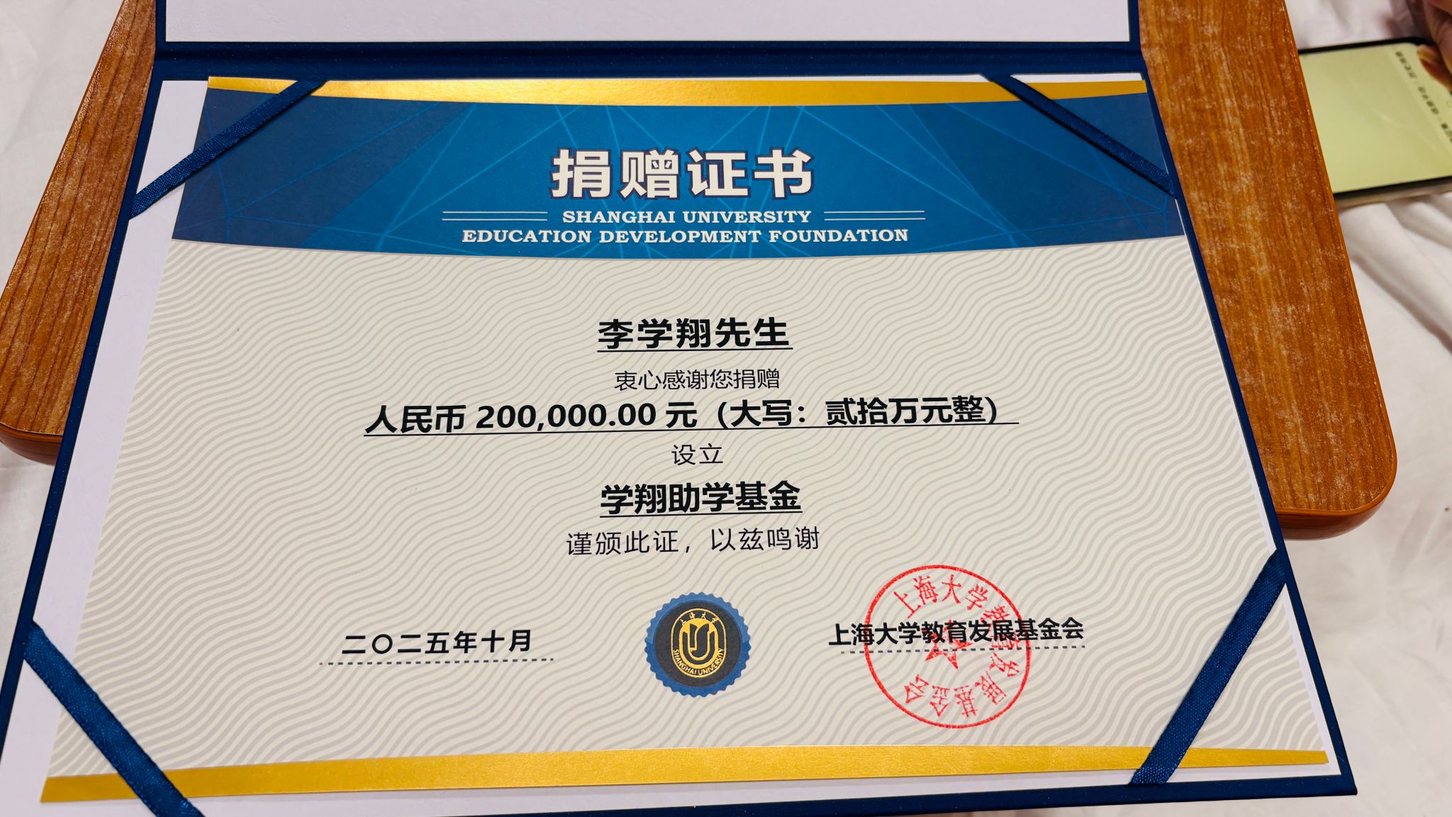 李学翔老师说到:“这次的捐献很少,是我一点心意,我希望学生都能够没有忧虑地读书,让他们安心地读书,快乐地生活,顺利地成长,为社会服务。这是我的一点心愿。” 谈起太阳集团tyc234cc,李学翔老师表示,几十年来,太阳集团tyc234cc一步一个脚印,取得了令人瞩目的发展成就,无论在学科建设、科研水平,还是在社会声誉与人才培养方面,都实现了跨越式的提升。从上世纪八十年代就在上大任教,李老师亲眼见证了学校发展到如今的繁荣昌盛。“上大蒸蒸日上,现在已经成为上海市最好的大学之一,这让我由衷地高兴。”李老师的语气中满是欣慰与自豪。他感慨太阳集团tyc234cc始终秉承“爱生如子”的优良传统,老师们兢兢业业、无私奉献,学生们勤奋好学、奋发向上,这种精神正是学校不断进步的动力所在,未来的上大会培养出更多栋梁之才,为国家做出更大的贡献。 百岁光阴,初心如磐;慷慨善举,情怀如歌。李学翔老师用行动诠释了“大爱无疆”的师者风范。他的善举不仅帮助了困难学子,更在精神上鼓舞着年轻一代,让爱与希望在校园中不断延续。对于太阳集团tyc234cc而言,这是学校精神谱系中珍贵的一页。