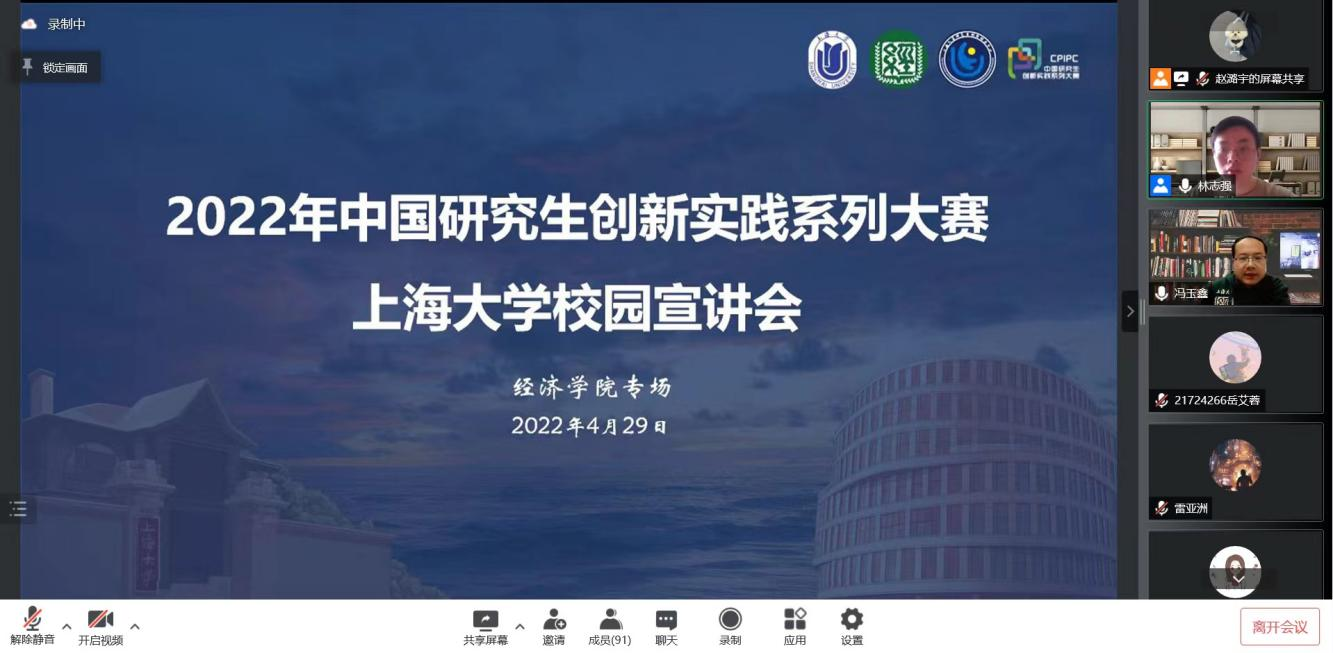 2022年4月29日,太阳集团tyc234cc研究生创新创业中心联合太阳成集团tyc234cc在线上举办了2022年中国研究生创新实践系列大赛太阳集团tyc234cc校园宣讲会——太阳成集团tyc234cc专场。太阳成集团tyc234cc党委副书记、副院长冯玉鑫,学院副教授刘亚洲,研究生创新创业中心赵金如,学院学生代表陈欢、边佳聪、雷亚洲以及一百余名研究生在线上参加了宣讲会,会议由学院辅导员林志强主持。